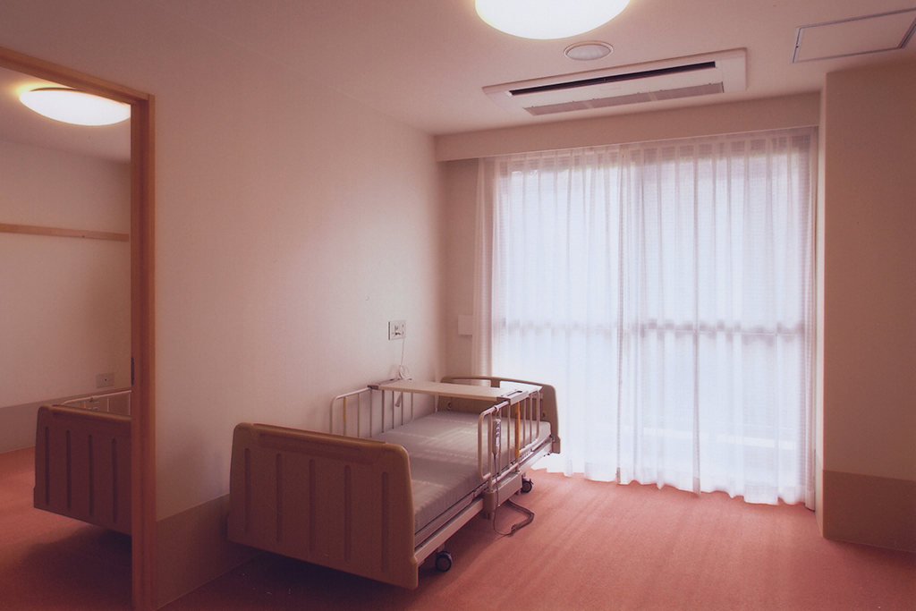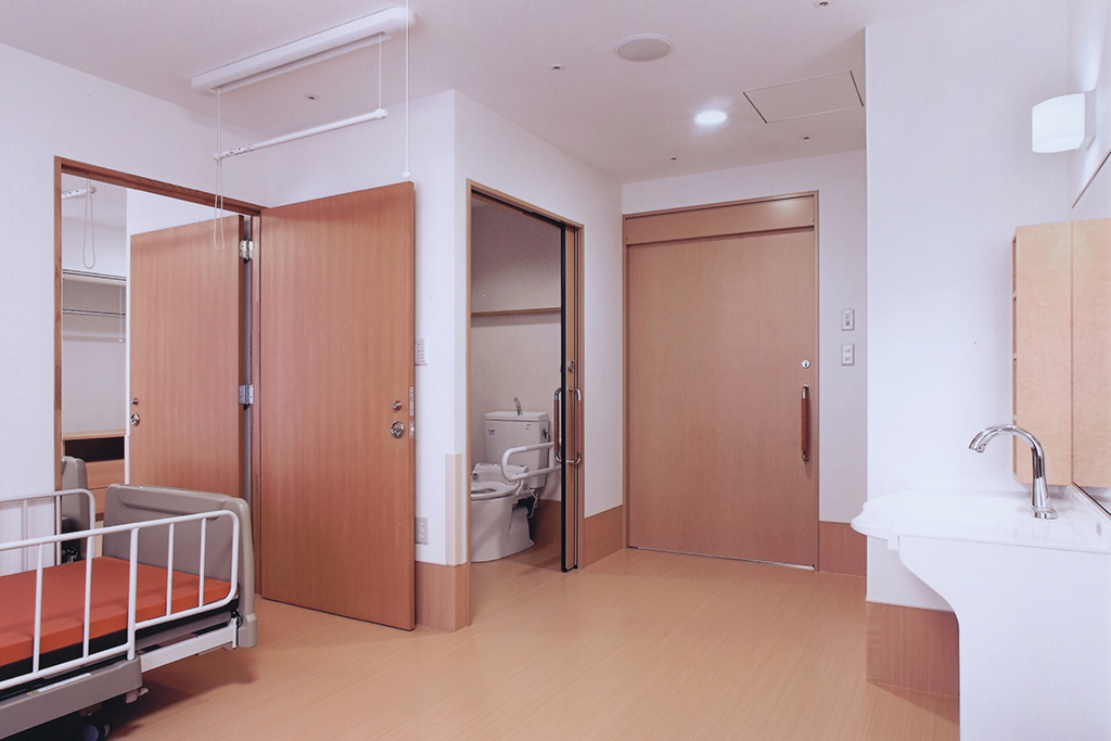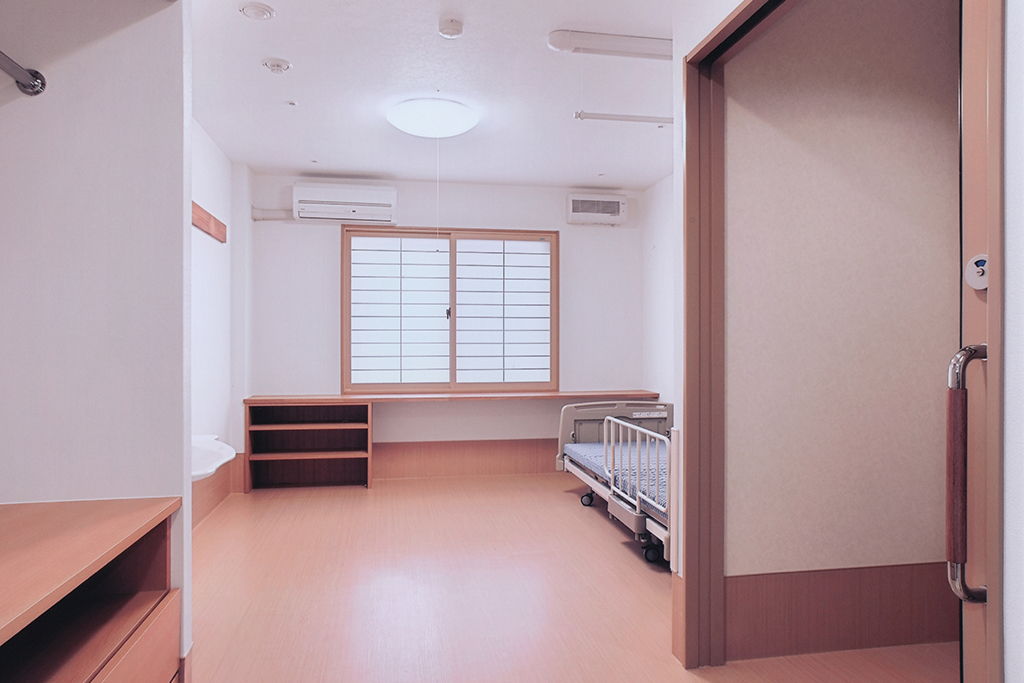 | 居室設備 | お一人様用・・・洋室18.15㎡・10畳(プライバシー保護されています) 温水洗浄機能付きトイレ、自動センサー付き洗面台、下駄箱、クローゼット、バルコニー、ナースコール エアコン、介護用電動ベッド(寝具付)、レースカーテン、電話端子、TV端子 |